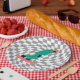 Freeride Snowboarder in grünem Anzug Schachgrau Pappteller