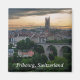 Die schöne Stadt Freiburg in der Schweiz bei Sonnenuntergang. Fügen Sie diesen Magneten Ihrem Kühlschrank hinzu, ob Sie ein Souvenir gewollt haben oder gewollt haben, um dieses Ziel in Ihre Schaufelliste aufzunehmen! Behalte, ändert oder entfernt den Text nach Belieben.