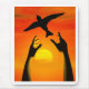 Zwei Arme, die einen Vogel mit einem herrlichen Sonnenuntergang hinter sich lassen
