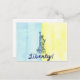 Ukrainische Flagge und die Statue der Freiheit. Schicken Sie diese Postkarte und ehren Sie die Gültigkeit des ukrainischen Volkes und die Ehre der Freiheit.