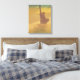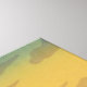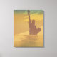 Das Bild zeigt die Freiheitsstatue, die an einem warmen, goldgelben Himmel mit subtilen Grün- und Blautönen in den oberen Ecken schallisoliert ist und das Ambiente von Sonnenuntergang oder Sonnenaufgang wiedergibt. Der untere Teil des Bildes zeigt Wasser, das die Farben des Himmels widerspiegelt und eine ruhige und reflektierende Stimmung erzeugt. Die Statue erscheint majestätisch und symbolisch, wobei die Fackel hoch gehalten wird, während ihre Reflektion im ruhigen Wasser unten schimmert.