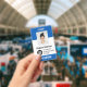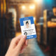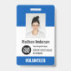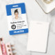 Personalisierter Name des Freiwilligen, Firmenlogo, Foto, Strichcode oder Qr Code ID-Abzeichen mit Clip oder Lanyard in leuchtenden, hellblauen und weißen Farbtönen.