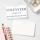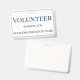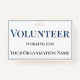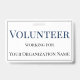 Dieses Identifizierungs-Abzeichen enthält den Titel "Volunteer", der in einem großen, fett blauen Schriftart in der Nähe der Oberseite des Abzeichens gedruckt wird. Der folgende Text enthält die Informationen über Freiwillige oder Mitarbeiter und den Namen des Unternehmens oder der Organisation. Das Abzeichen zur Identifizierung von Freiwilligen ist mit einem einfachen, grauen Rahmen begrenzt.