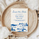 French blue save the date card featuring a whimsical hand-drawn countryside landscape with rolling hills, trees, and a charming European villa scene. The clean, elegant layout highlights your wedding details on the front, while the back includes space for a personalized couple photo. Inspired by pastoral European settings and destination weddings, this design blends classic charm with a relaxed, romantic feel. Easily customize with your names, date, location, website, and photo to create a coordinated and timeless announcement.