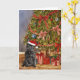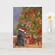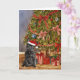 Diese Weihnachtskarte enthält ein Aquarellbild eines schwarzen französischen Bulldoggen mit einer Weihnachtsmannmütze, die unter einem Weihnachtsbaum sitzt.