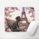 A French bulldog in a beret sits on a bench amidst cherry blossoms, with the Eiffel Tower creating a charming backdrop for a perfect Parisian springtime scene