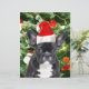 Niedlicher französischer Bulldogge mit Weihnachtsbaumschmuck Snow Man im Hintergrund.