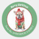 Ein Bild eines bezaubernden französischen Bulldog mit einem grünen Pullover und einem roten Muster Winterschal und Hut steht im Mittelpunkt dieses Holiday Aufklebers. Das Bild ist in einem kreisrunden grünen Rahmen gerahmt, der den benutzerdefinierten Text in Weiß enthält. Niedlich für Weihnachtskarten, Korrespondenz und Geschenkpakete.