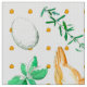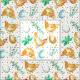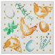 Ein lustiger Stoff für Hühnerliebhaber, der mit goldbraunen Hühnern, Eiern und Kräutern geschmückt ist, die mit Aquarell und honiggelben Polka-Punkten im Hintergrund bemalt sind. Ideal für Küchendekoration, Kunsthandwerk und Quilting-Projekte!
