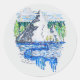 Der Berg, der eine ruhige Landschaft prägt, erhebt sich majestätisch mit seiner Reflexion, die sich im ruhigen See unter ihm spiegelt. Umgeben von üppigen grünen Bäumen und einem blauen Himmel mit einer vorübergehenden Wolke, erinnert die Szene an ein Gefühl von Ruhe und natürlicher Schönheit. Die Verwendung kühner Konturen verleiht dem Bild ein skurriles, fast kartoonisches Gefühl.