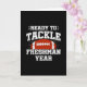 Dieses lustige Frischmannjahrdesign ist perfekt für einen High School-Frische-Football-Spieler oder 9. Klasse Lehrer, die Lieben, ihre High School Fußball-Mannschaft zu unterstützen! Perfekt für den Rückweg in die Schule, den 8. Abschluss oder das ganze Schuljahr! Features "Ready to Tackle Freshman Year" High School Frischman Zitat mit Fußball Grafik. Ideal für einen Lehrer der 9. oder 9. Klasse, der Lieben hat, Fußball zu sehen oder zu spielen!