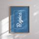 Minimalistisches Urlaubsposter mit "Rejoice" in weißer Schrift auf einem weichen, blauen Hintergrund, gerahmt mit einem Bogen und einem scharfen Rand. Ideal für moderne Weihnachtsmauer-Dekoration oder saisonale Feiern.