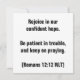 Freuen Sie sich auf unsere selbstbewusste Hoffnung. Sei geduldig in Schwierigkeiten und behalt auf beten. (Römer 12:12 NLT) Die Römer 12:12 ermutigen uns, Freude in Hoffnung, Geduld in Bedrängnis und Treue im Gebet zu begreifen. Lassen Sie uns an diesen Tugenden festhalten und auf Gottes Versprechen und Seinem perfekten Timing unter allen Umständen vertrauen.