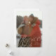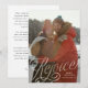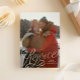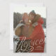 Eine religiöse Weihnachtsfotokarte mit "Rejoice"-Text, überlagert in einer Vintagen, luxuriösen Schrift auf dem Foto. Die Rückseite der Karte hat Platz für eine längere Nachricht.