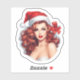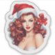 Eine lebendige Abbildung zeigt eine charmante Frau mit lustigen, lockigen Haaren, die mit einer klassischen roten Weihnachtsmannmütze und einem auffälligen roten Bogen geschmückt ist. Ihr fröhlicher Ausdruck verkörpert den festlichen Geist der Weihnachten, strahlt Wärme und Feiertagssaufe aus.