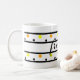 Freunde werden in der Mitte von Tasse in elegantem schwarzen Skript geschrieben. Farbige geometrische Formen mit schwarzen Streifen und orangen und gelben Polka-Punkten auf weißem Hintergrund. Personalisieren Sie Ihre Mit Monogramm Initial- oder andere Textdatei, die in schwarzem Text angezeigt wird, oder löschen Sie sie. Helle, lustige kreisförmige Formen. Original Kunstwerk Design © TamiraZDesign. www.zazzle.com/tamirazdesigns