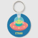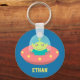 Eine farbenfrohe Schlüsselkette mit einer niedlichen und fröhlichen grünen Alien mit herzförmigen Antennen, was bedeutet, dass es eine freundliche Alien ist und in Ruhe kommt und Freunde findet. Es reist in einem winzigen Raumschiff durch die Galaxie. Ideal für Kinder, die Raumthemen, Raketen und Ufos Liebe. Personalisieren mit Namen.
