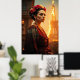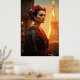 Eine Hommage an Frida Kahlos Geist, der hell und ungebrochen brennt. Dieses surreale Portrait mit Blumenkronen und feuerbeleuchtetem Himmel verbindet Tradition und Rebellion. Vintage Texturen treffen auf moderne Mystik. Häng es laut, hänge es stolz. Ich bin meine eigene Muse. Ich bin die Flamme