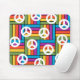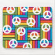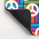 Dieses Mauspad hat ein Design von Quadraten, die aus Rechtecken in hellen Farben der 70er Jahre bestehen, wobei sich die Friedenssymbole um sie herum verstreut.