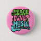 Retro-Stil Art Design der PEACE LIEBE MUSIC mit Stille Symbol, Herz, Gitarre und musikalische Noten in grün, rosa und blau.