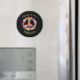 Dieser Magnet weist ein Blumenfriedzeichen in Rosa, Gelb, Orange, lila, Grün, Weiß und Schwarz auf, das von "Peace, Liebe, Happiness" umgeben ist.