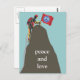 Frieden und Liebe wünschen. Ein Bergsteiger mit einer Friedenssymbolflagge auf der Bergspitze