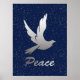 Druck einer Taube und das Wort Frieden in einem silbernen, metallischen Effekt-Gefälle, auf einem tiefblauen Sternenhimmel Hintergrund