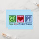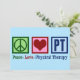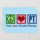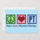 Diese niedliche Physiotherapeut-Karte verfügt über ein Friedenszeichen, Herz und die Buchstaben PT für die Physiotherapie. Großartige Urlaubskarten oder Weihnachtskarten für ein Büro oder ein Geschäft mit Physiotherapie.