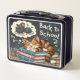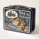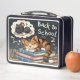 Diese ruhige Lunchbox bietet eine entspannte Katze, die auf einem Stapel Bücher klatscht, die von Mäusen träumen. Das Design betont Ruhe und Ruhe. "BACK TO SCHOOL" ist in einem Schriftart mit weichem Schriftsatz geschrieben. Ideal für diejenigen, die einen Augenblick der Ruhe suchen.