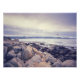 Der Panoramablick auf eine felsige Küste mit einer großen Wasserfläche, die sich in der Ferne erstreckt. Der Himmel ist weich, lila mit Weisheitswolken, und eine Herde Pelikane fliegt über den Rahmen. Im Vordergrund dominieren große, graue und braune Felsen, die vom Meer übersät sind. Das Wasser ist ruhig und reflektierend, in der Ferne ist ein Hauch von Blau erkennbar. Das Bild wurde im kalifornischen Pebble Beach aufgenommen.