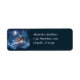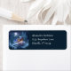 Eine friedliche Szene in einem schneebedeckten Winterwald. Eine gemütliche Hütte mit warmem Licht, das in ihren Fenstern leuchtet, Weihnachtslichter auf ihrem Vorbaudach und einem Kranz an ihrer Tür sitzt unter einem Vollmond, umgeben von hohen Kiefern.