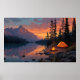 Eine atemberaubende und ruhige Illustration einer Camping-Szene bei Sonnenuntergang an einem ruhigen Bergsee. Ein leuchtendes gelbes Zelt und ein warmes Lagerfeuer liegen am Felsrand, umgeben von hohen Pinienbäumen. Der lebhafte orange und rosa Himmel spiegelt sich wunderbar im stillen Wasser wider und spiegelt die majestätischen Berge und Wälder wider.