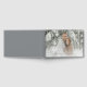 Dieser Umschlag für das Hochzeitsgästebuch zeigt eine ruhige Winterlandschaft mit zwei Personen, die eng beieinander in einem schneebedeckten Wald stehen, umgeben von schneebedeckten Bäumen. Die Farbpalette wird von kühlen Weißen und Grautönen dominiert, die mit den warmen Tönen ihrer Kleidung kontrastieren und eine harmonische Mischung erzeugen, die das winterliche Gefühl verstärkt. Das Design verwendet eine elegante Serifenschrift für anpassbare Namen und Daten unten in der Mitte, was dem romantischen Thema eine klassische Note verleiht. Die Gesamtstimmung ist intim und friedlich, perfekt für die Feier einer Verlobung oder Hochzeit in einer malerischen Kulisse.