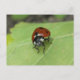 Ein freundlicher 7 gepunkteter Ladybug, der auf einem grünen Blatt posiert.
