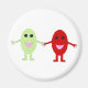 Ein Magnet mit einem Cartoon einer lächelnden roten Traube mit Händen mit einem lächelnden grünen Traube, beide Trauben haben glänzende schwarze Augen und rosa Mund.