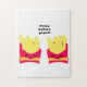 Zwei Pommes frites-Container lächeln, eines davon Sprichwort "Fries before Typ!!". Das farbenfrohe und spielerische Design verleiht eine humorvolle und herzliche Botschaft.