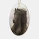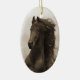 Das ist ein sepia-Bild eines friesischen Hengstes, der in Kalifornien auf einem Ornament läuft. Bild von Carol Walker auf diesem Feiertagsschmuck.