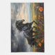 Ein atemberaubendes, schwarzes Friesiepferd inmitten lebendiger Wildblumen, mit einer dramatischen stürmischen Himmelskulisse, die ein Gefühl von Power und Eleganz schafft.