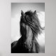 Friesischer Hengst im Wind. Headshot von Friesischer Hengst. Diese Pferde sind vielleicht eine der anmutigsten und eindrucksvollsten Rassen. Beeindruckend wegen ihrer Größe und ihres starken Aussehens. Schwarz-Weiß-Bild. Bild von Jan Brons
