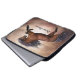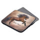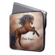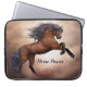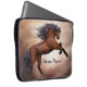 Friesisches braunes Pferd, das oben mit Laptopschutzhülle