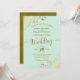 Diese schöne Hochzeitseinladung zeichnet sich durch ein schlichtes und dennoch elegantes Design aus, das auf einem blassgrünen Hintergrund mit zartem Schriftzeichen kalligraphisch dargestellt ist und in den Ecken schmucke goldfarbene Imitate filigrane Filigree zeigt. Der Rücken ist eine goldfarbene Farbe aus Mottel oder Marmor. Die Formulierung ist formell, aber die Gestaltung ist modern und stilvoll.