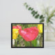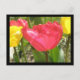 Diese hübsche, blumengeschmückte Postkarte zeigt ein Foto von rot-gelb gefangenen Tulpen. Das Foto wurde mit Makrofotografie gemacht, was zu so brillanten Details führte, dass man die kleinen Ränder und subtilen Veränderungen im Schauspiel auf der mittleren Tulpe sehen kann.