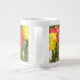 Diese phantastische Tasse zeigt ein Foto von rot-gelb gefangenen Tulpen. Das Foto wurde mit Makrofotografie gemacht, was zu so brillanten Details führte, dass man die kleinen Ränder und subtilen Veränderungen im Schauspiel auf der mittleren Tulpe sehen kann.