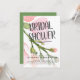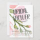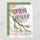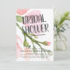 Eine frische und moderne Braudusche mit einem großen, rosa und grünen Blumenzweig, überlagert mit der Phrase "Brautparty" in dunkelgrauem Pinsel Schriftart, und Details der Veranstaltung im modernen Schriftart. Die Rückseite ist in Vollgrün überlagert mit einem überlappenden Kreismuster.