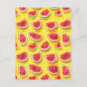 Ein helles und erfrischendes Top-Down-Muster aus verschiedenen dreieckigen und D-förmigen Wassermelonen-Scheiben, die ihr lebendiges rotes Fleisch und ihre schwarzen Samen zeigen, Set vor einem fröhlichen gelben Hintergrund.
