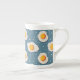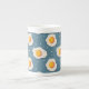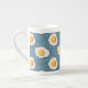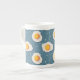 Ein Muster aus frischen, gebratenen Eiern auf himmelblauem Hintergrund. Frühstück:)