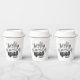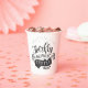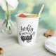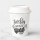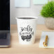 Diese heiße Getränketasse enthält knebelige Handschrift, die auf weißem Hintergrund "Frischgebackener Kaffee" sagt. Die Schrift enthält dekorative Wimpern und dekorative Wirbel.