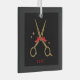 Ändern Sie den Namen auf der Vorderseite leicht! Golden Glitzer Schere klassische schwarze Farbkombination. Elegantes Haarstylistin-Geschenk mit rotem Band (Foto Element).