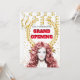Die perfekte Möglichkeit, die Eröffnung Ihres neuen Friseur-/Friseursalons mit dieser Illustration zu verkünden, die einen goldenen Lorbeerkranz mit einem schwarz-roten Set auf weißem Hintergrund darstellt. Der Kranz wird durch senkrechte hängende Imitate mit Goldschläuchen gerahmt; roter Teppichboden mit aufrecht stehenden Stangen, die durch rotes Kordel und luxuriöse Glitzer-Sequins miteinander verbunden sind. Eine wunderschöne Frau mit langen roten Haaren ist in der Mitte stehend und von den Schultern nach oben sichtbar. Mit dieser Einladung, die Kunden und Gäste begeistern wird, stellen Sie sicher, dass Ihre ersten Eindrücke von Dauer sind.