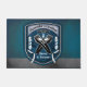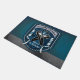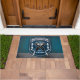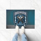 Stellen Sie eine Friseursalonrasur- und -haarschnitteingangsmatte des Monogramms persönliche altmodische her. Ikonenhafte Friseurpfosten der Ausrüstungsbeschreibungen, Rasiermesser, Rasierapparate, Bürste und hübscher Schnurrbart.